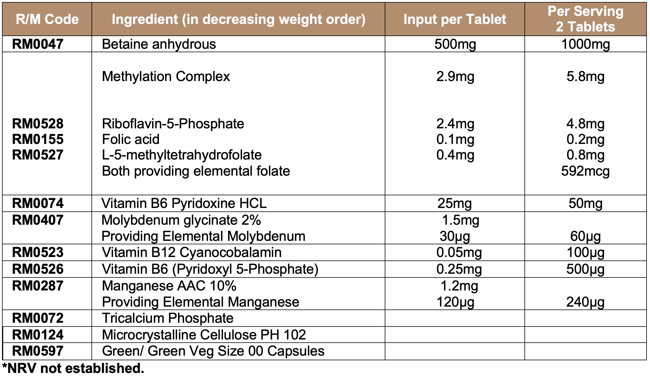 Specially formulated with TMG (to improve methylation), Folic acid delivered as L-5 Methytetrahydrofolate (in a more absorbable form), Pteroylmonoglumatic acid, B6,